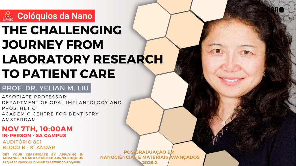 O Programa de Pós-Graduação em Nanociências e Materiais Avançados (Nano) da UFABC convida a comunidade acadêmica para o próximo evento dos Colóquios da Nano. Amanhã, 7 de Novembro, às 10h00, teremos a honra de receber a Prof. Dr. Yelian M. Liu, Associate Professor do Departamento de Implantodontia Oral e Protética do Academic Centre for Dentistry,…