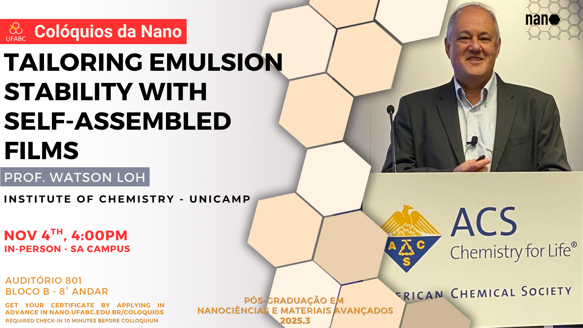 O Programa de Pós-graduação em Nanociências e Materiais Avançados tem a satisfação de convidar a comunidade acadêmica para a próxima edição do seu Colóquio, que contará com a presença do renomado Prof. Dr. Watson Loh, Professor Titular da Universidade Estadual de Campinas (UNICAMP). A palestra, intitulada “Controlling Emulsion Stability Using Self-assembled Films” (Controle da Estabilidade de Emulsões Usando Filmes Auto-organizados), será realizada no dia 04 de novembro, às 16 horas, no Auditório da Pós-graduação.